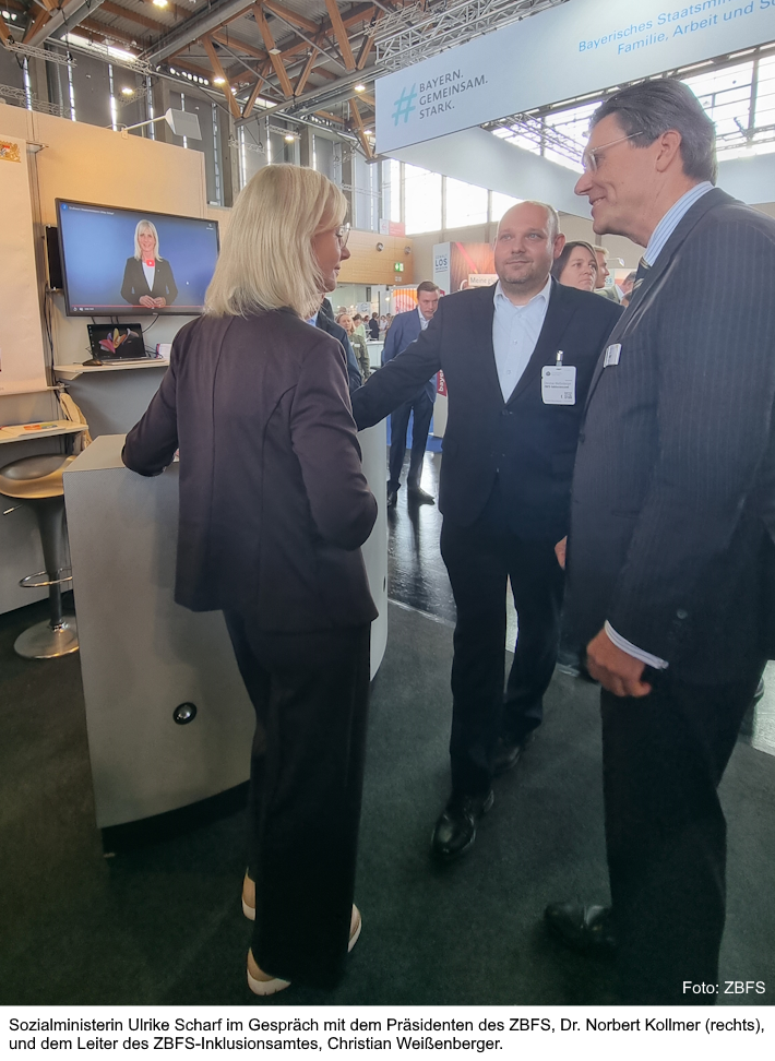 Der Präsident des ZBFS, Dr. Norbert Kollmer, und der Leiter des ZBFS-Inklusionsamtes, Christian Weißenberger, freuten sich, die Sozialministerin Ulrike Scharf am Messestand des ZBFS begrüßen zu dürfen.